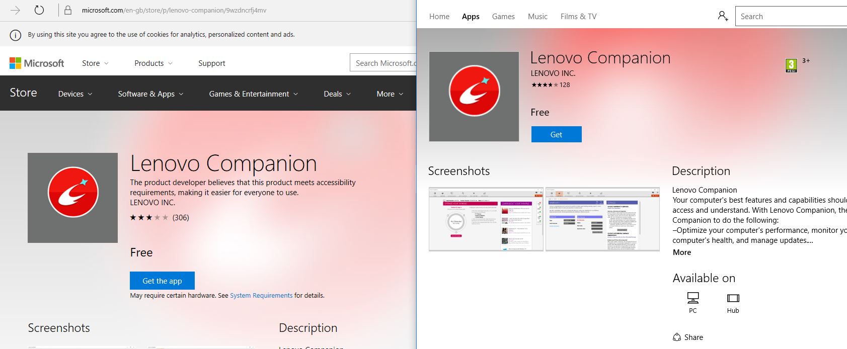Searching google took me to Microsoft page on the left, which popped up the App store page on the right, but they details / ratings did not match up. So I was not going to even bother working out which was which, so now I am returned the computer to the retailer, who have had no qualms and took it in for repair.